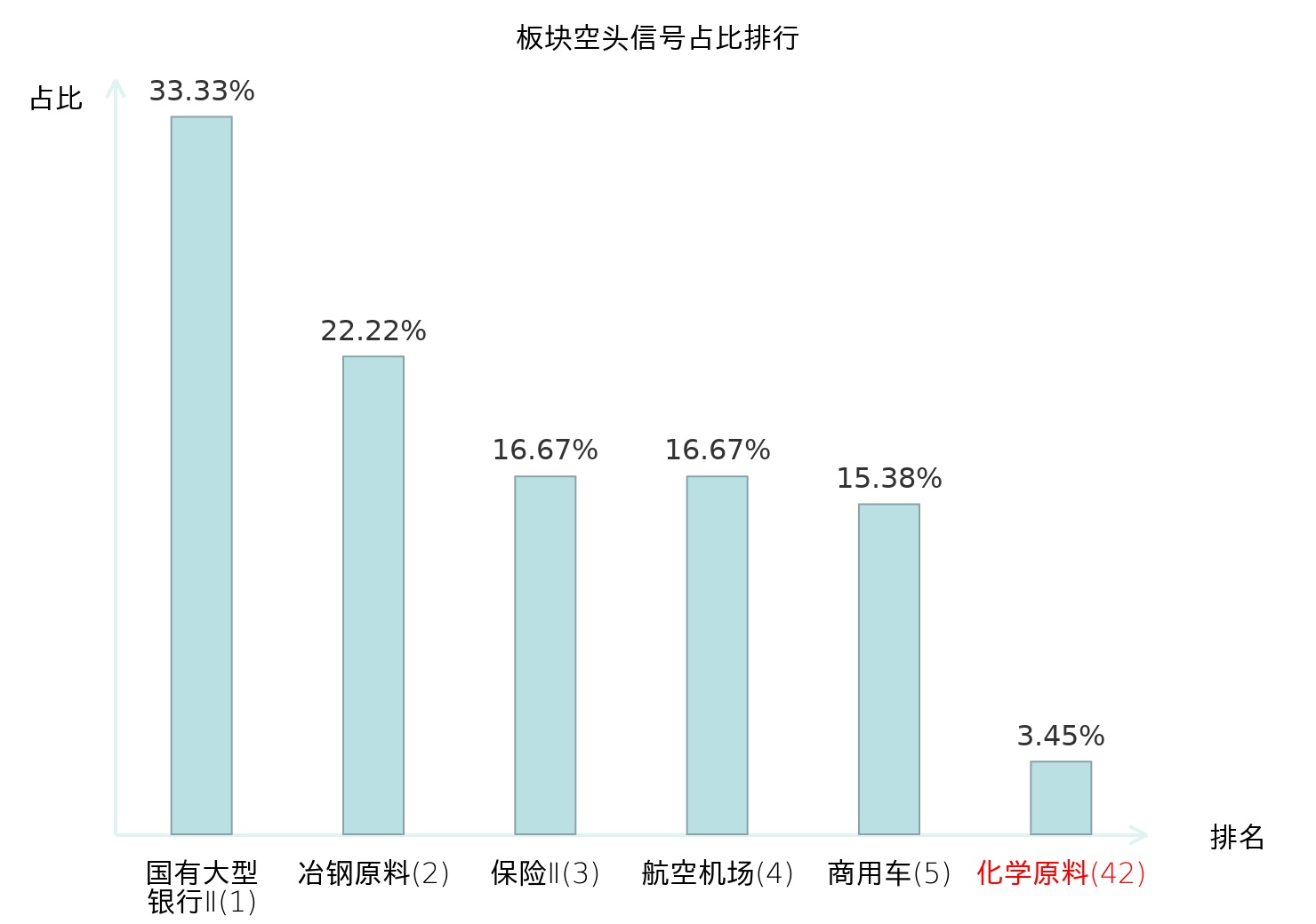 全市场所有行业板块中主力空头信号占比排名中,国有大型银行Ⅱ板块位居第一。航运港口板块名次提升最快,较昨日上升113位。