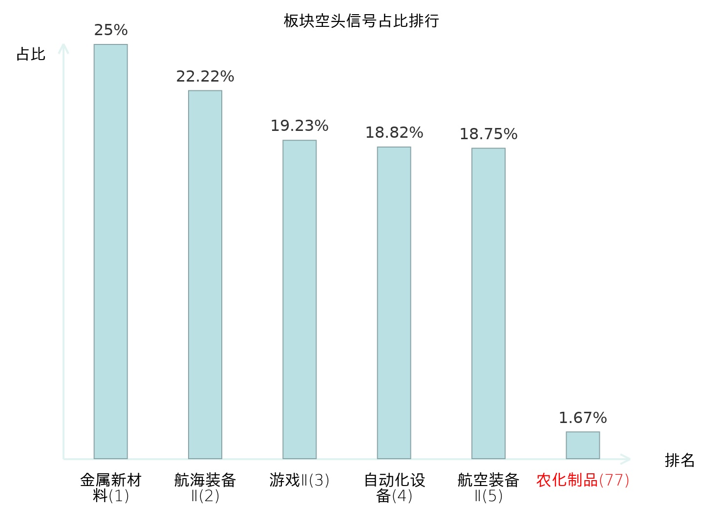 全市场所有行业板块中主力空头信号占比排名中,金属新材料板块位居第一。证券Ⅱ板块名次提升最快,较昨日上升120位。