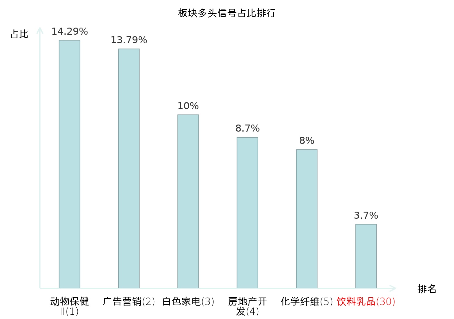 全市场所有行业板块中主力多头信号占比排名中,动物保健Ⅱ板块位居第一。动物保健Ⅱ板块名次提升最快,较昨日上升100位。