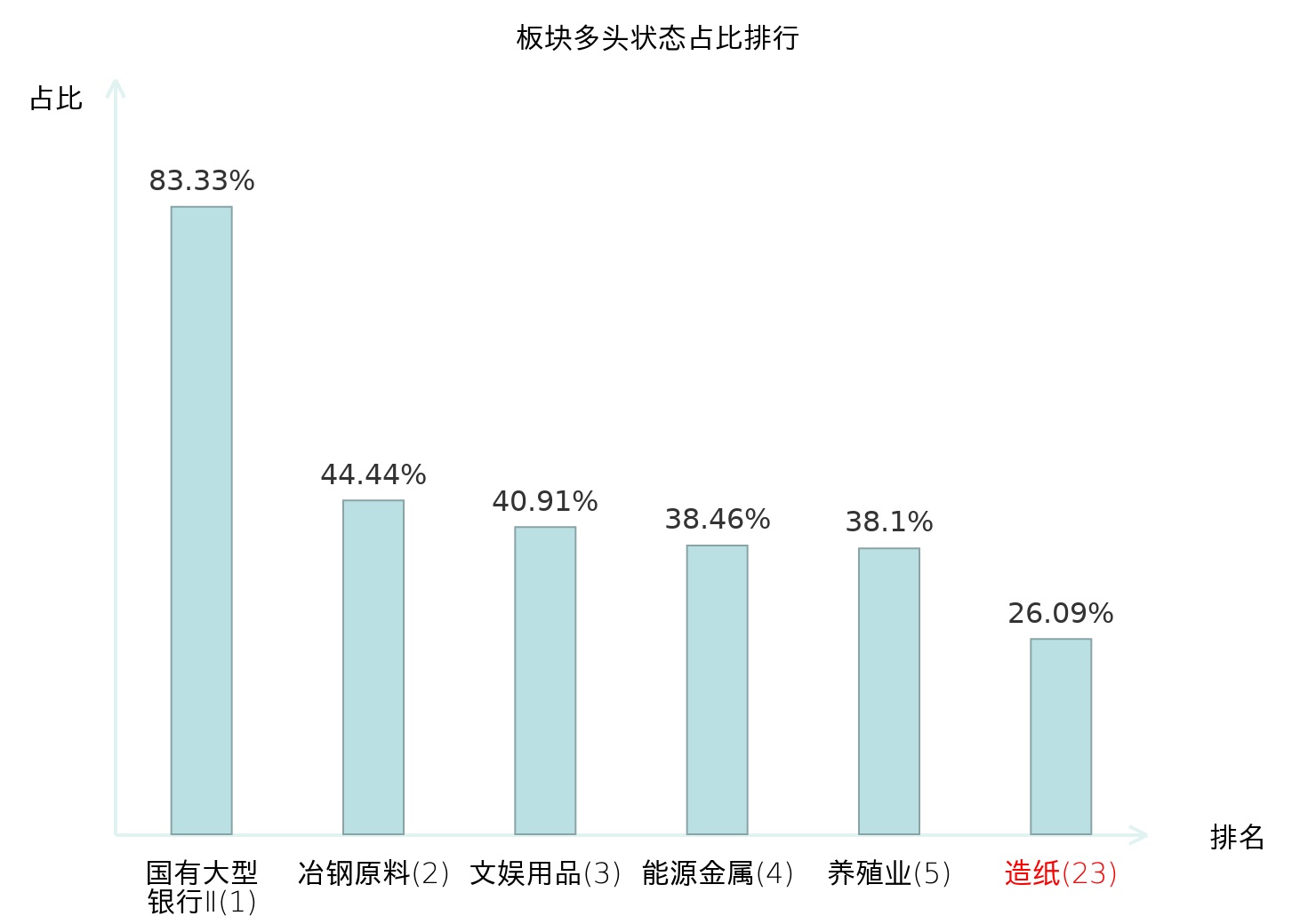 全市场所有行业板块中主力多头状态占比排名中,国有大型银行Ⅱ板块位居第一。影视院线板块名次提升最快,较昨日上升54位。