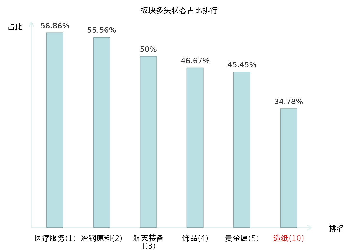 全市场所有行业板块中主力多头状态占比排名中,医疗服务板块位居第一。旅游及景区板块名次提升最快,较昨日上升61位。