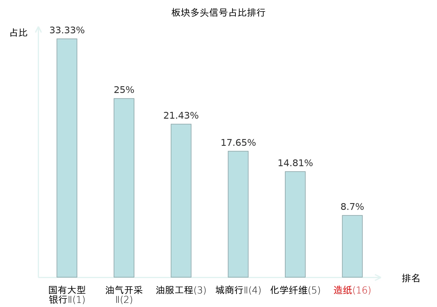 全市场所有行业板块中主力多头信号占比排名中,国有大型银行Ⅱ板块位居第一。国有大型银行Ⅱ板块名次提升最快,较昨日上升124位。