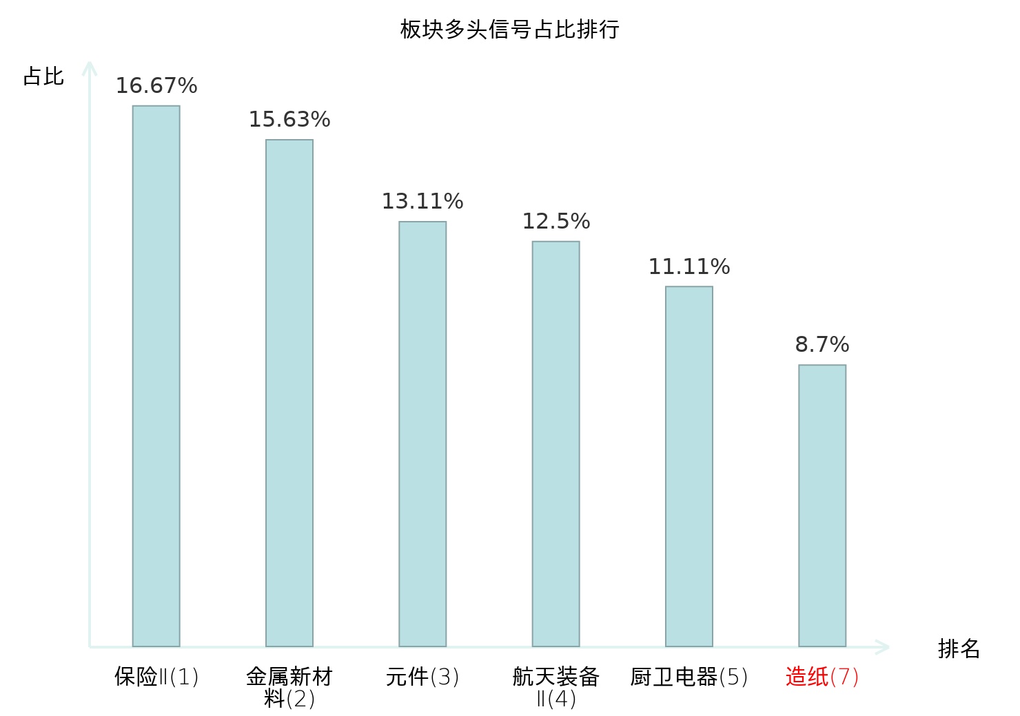 全市场所有行业板块中主力多头信号占比排名中,保险Ⅱ板块位居第一。保险Ⅱ板块名次提升最快,较昨日上升123位。