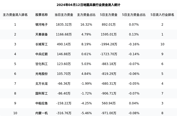 从主力资金流向来看,地面兵装行业今日主力资金流入2.26亿元,在所有申万二级行业中排名:121/131。