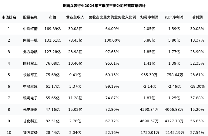 北方导航最新报告期数据为三季度,下表汇总了地面兵装行业内市值靠前的公司三季度主要经营数据