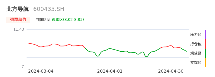我们来看一下该股的九方特色指标强弱趋势的情况:北方导航近日从持仓区下穿到观望区,股价出现持续性调整行情。短期已经转为空头行情,且下跌动能仍未衰竭。建议继续谨慎观望。