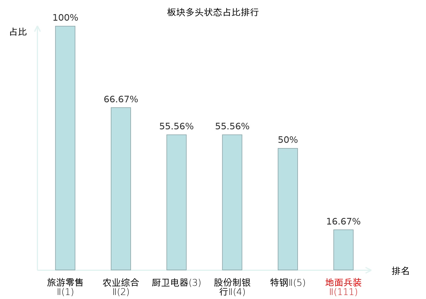 全市场所有行业板块中主力多头状态占比排名中,旅游零售Ⅱ板块位居第一。装修装饰Ⅱ板块名次提升最快,较昨日上升75位。