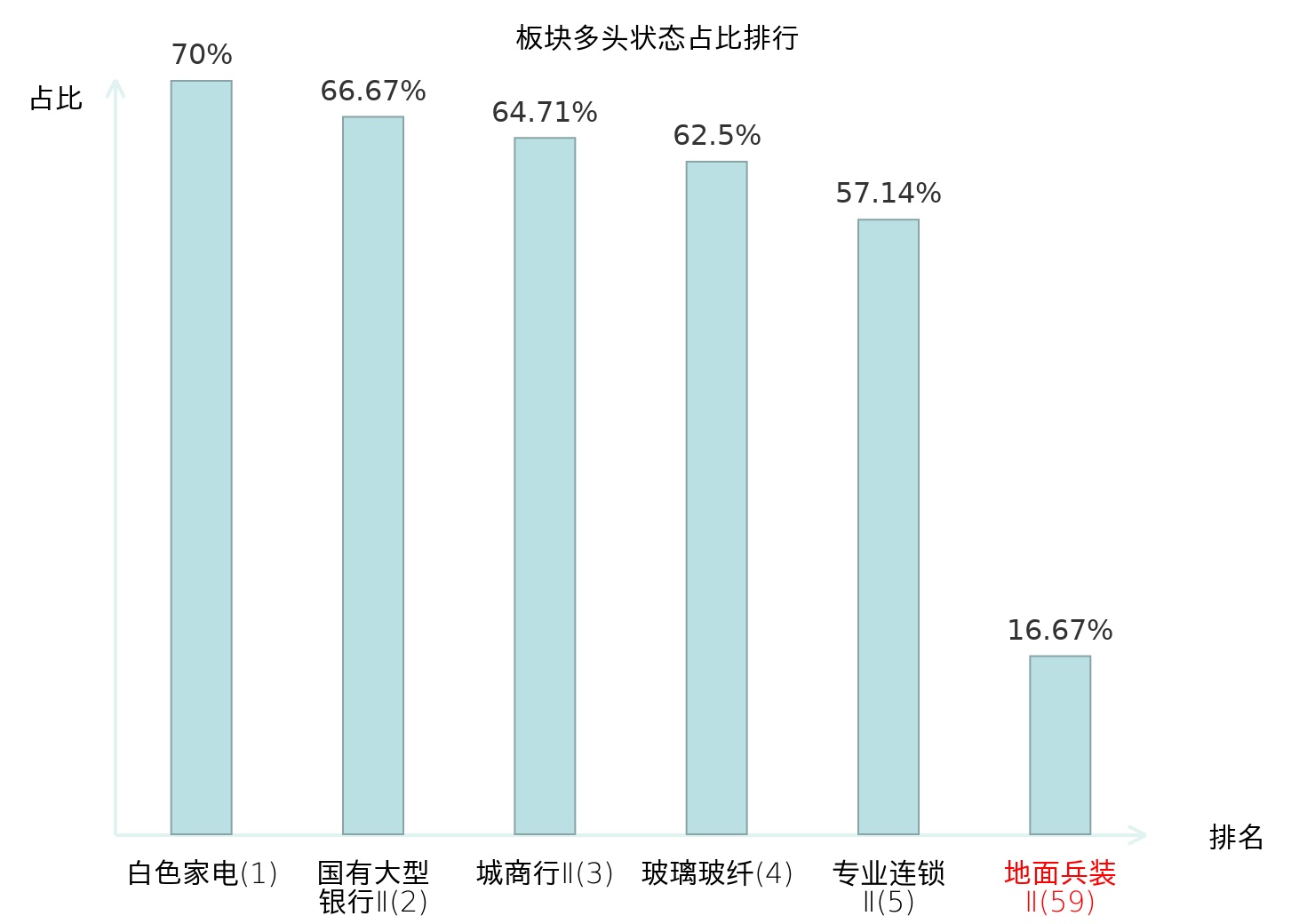 全市场所有行业板块中主力多头状态占比排名中,白色家电板块位居第一。油气开采Ⅱ板块名次提升最快,较昨日上升96位。