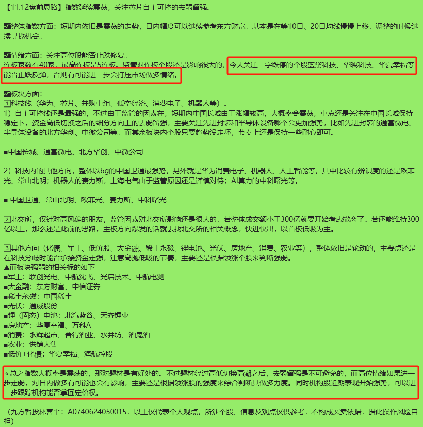 从策略上来说,后市【中国软件】的强度相对来说就比较关键了,同时关注高位科技股【华映科技】、【中化岩土】能否打开跌停板,否则做多情绪仍旧会比较弱势。若做多情绪能得到修复,比如今天强势的非科技的【英洛华】能进一步走强,那对于市场来说肯定是好事。届时可以关注率先止跌且领涨的科技分支,而选股上不管是大成交额还是小成交额,还是尽量选择10个交易日内距离100%涨幅仍有较大空间的个股,有会议消息刺激的更好。而对于持仓来说,只要趋势没有走坏,就可以多保持一些耐心。