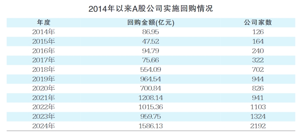2024年,在一系列政策支持引导下,A股市场掀起了回购热潮,回购总金额达1586.13亿元,较2023年增长65%,创出历史新高。而A股公司此前的年度回购金额纪录是2021年的1208.14亿元。
