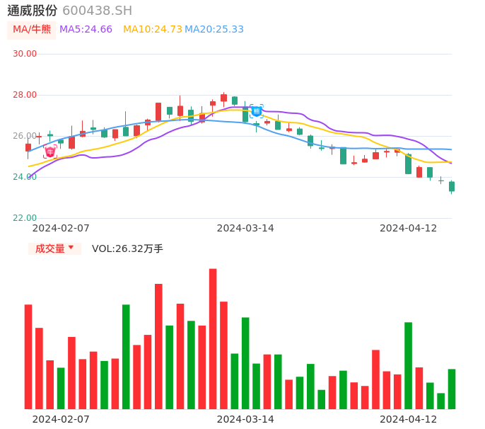 04月12日,通威股份收报23.31,股价涨幅-2.10%,成交金额6.16亿元,换手率0.58%。