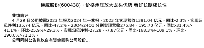 值得注意的是:2024年04月国金证券的姚遥/张嘉文分析师,首次发布关于通威股份的研究报告,标题为:通威股份(600438):价格承压放大龙头优势 看好长期成长性。
