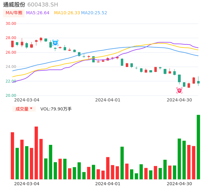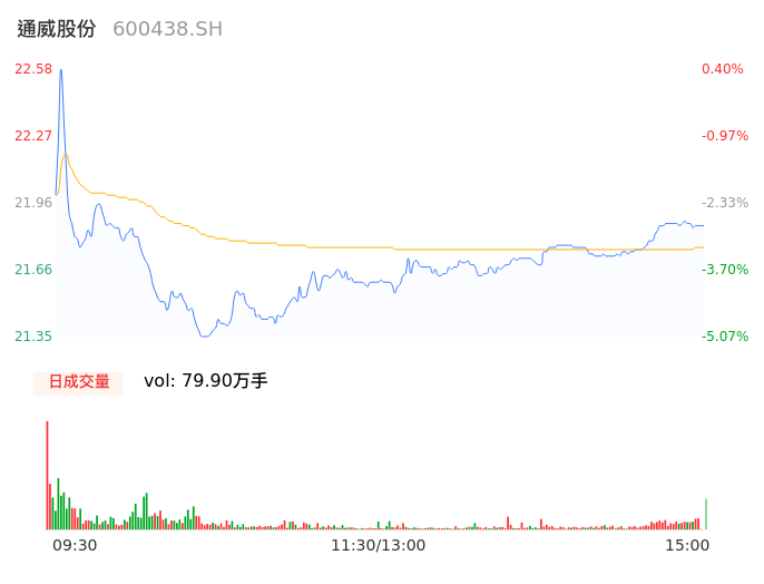 04月30日,通威股份收报21.70,股价涨幅-3.51%,成交金额17.38亿元,换手率1.77%。