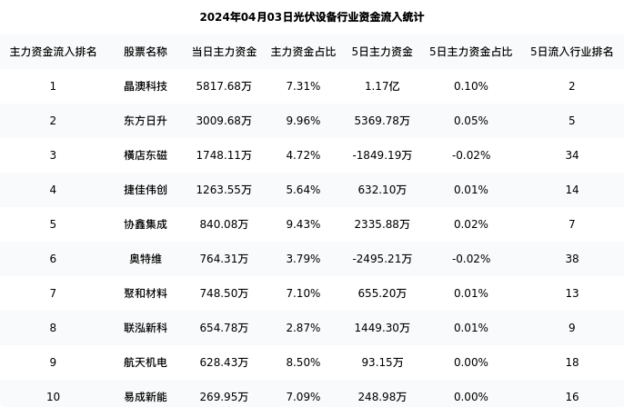 从主力资金流向来看,光伏设备行业今日主力资金流入40.39亿元,在所有申万二级行业中排名:99/131。