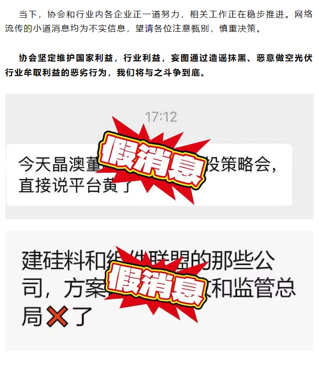 对此,中国光伏行业协会紧急辟谣,称网络流传消息均为不实信息。中国光伏行业协会执行秘书长刘译阳在朋友圈发文回应传言,表示"光伏行业不走出内卷式恶性竞争誓不罢休"。