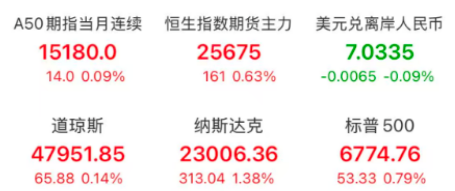 美股三大指数集体收涨,大型科技股普涨,存储概念、半导体设备与材料涨幅居前,美光科技涨超10%,SanDisk涨超6%,西部数据涨超5%。