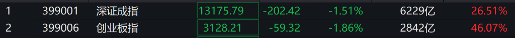 深成指、创业板指均跌超1%,沪指跌0.27%,贵金属、电池、半导体、PCB等方向跌幅居前,沪深京三市下跌个股超2600只。