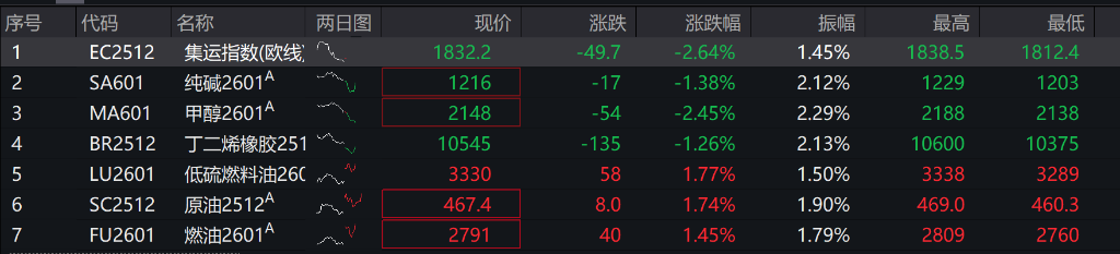 商品期货开盘,集运欧线主力合约跌超3%,纯碱、甲醇、BR橡胶跌超2%。LU燃油、原油、燃料油、菜籽油涨超1%。