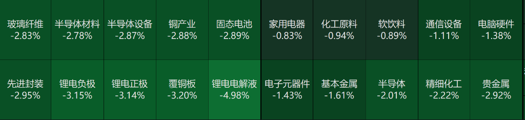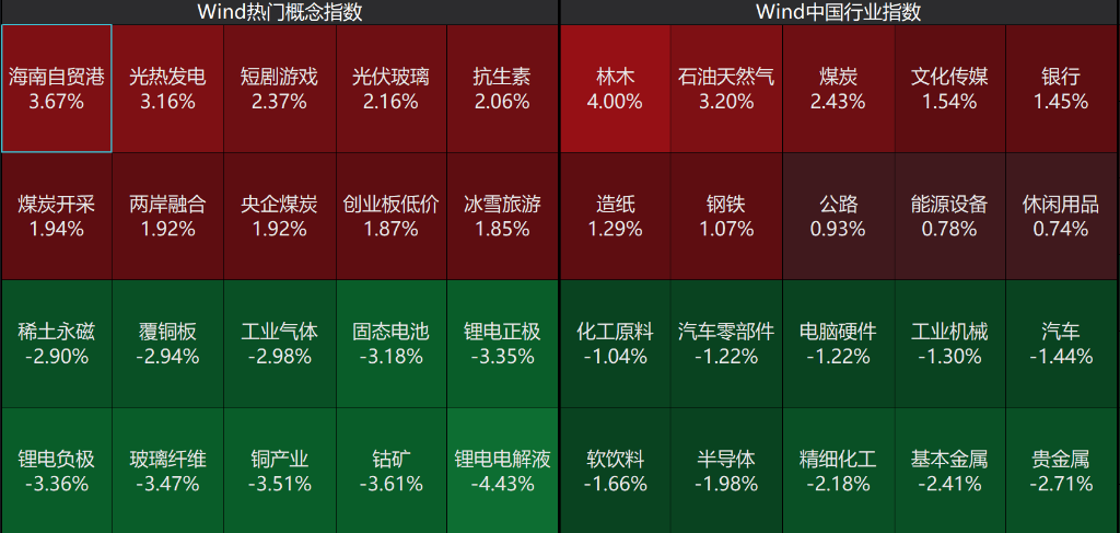 板块概念方面,核电、海南自贸区、船舶制造、煤炭等板块领涨;电池、贵金属、稀土永磁、半导体等板块领跌;