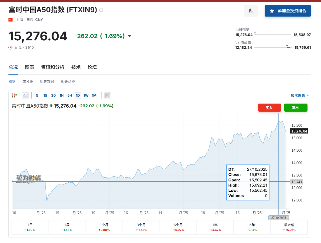 富时中国A50指数期货盘初涨0.28%,午后收涨0.03%,上一个交易日夜盘收涨0.19%。