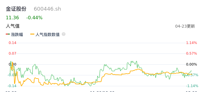 04月23日,金证股份收报11.36,股价涨幅-0.44%,成交金额1.74亿元,换手率1.63%。