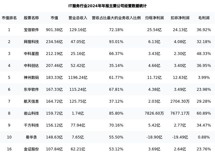 金证股份最新报告期数据为年报,下表汇总了IT服务行业内市值靠前的公司年报主要经营数据