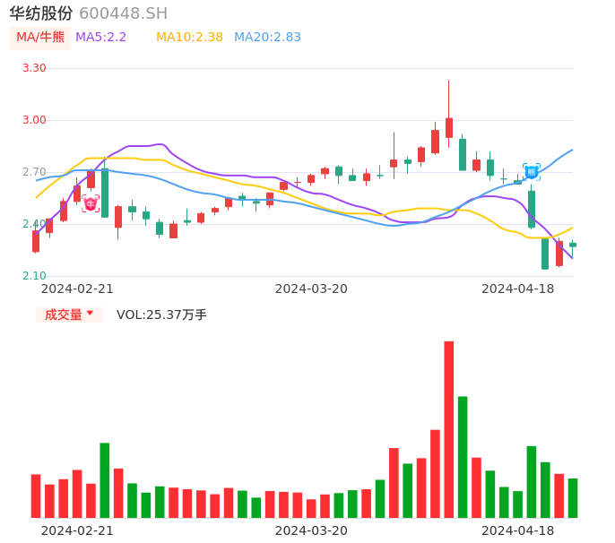 04月18日,华纺股份收报2.27,股价涨幅-1.30%,成交金额5763.00万元,换手率4.03%。
