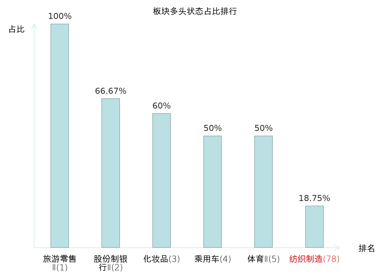 全市场所有行业板块中主力多头状态占比排名中,旅游零售Ⅱ板块位居第一。旅游零售Ⅱ板块名次提升最快,较昨日上升130位。