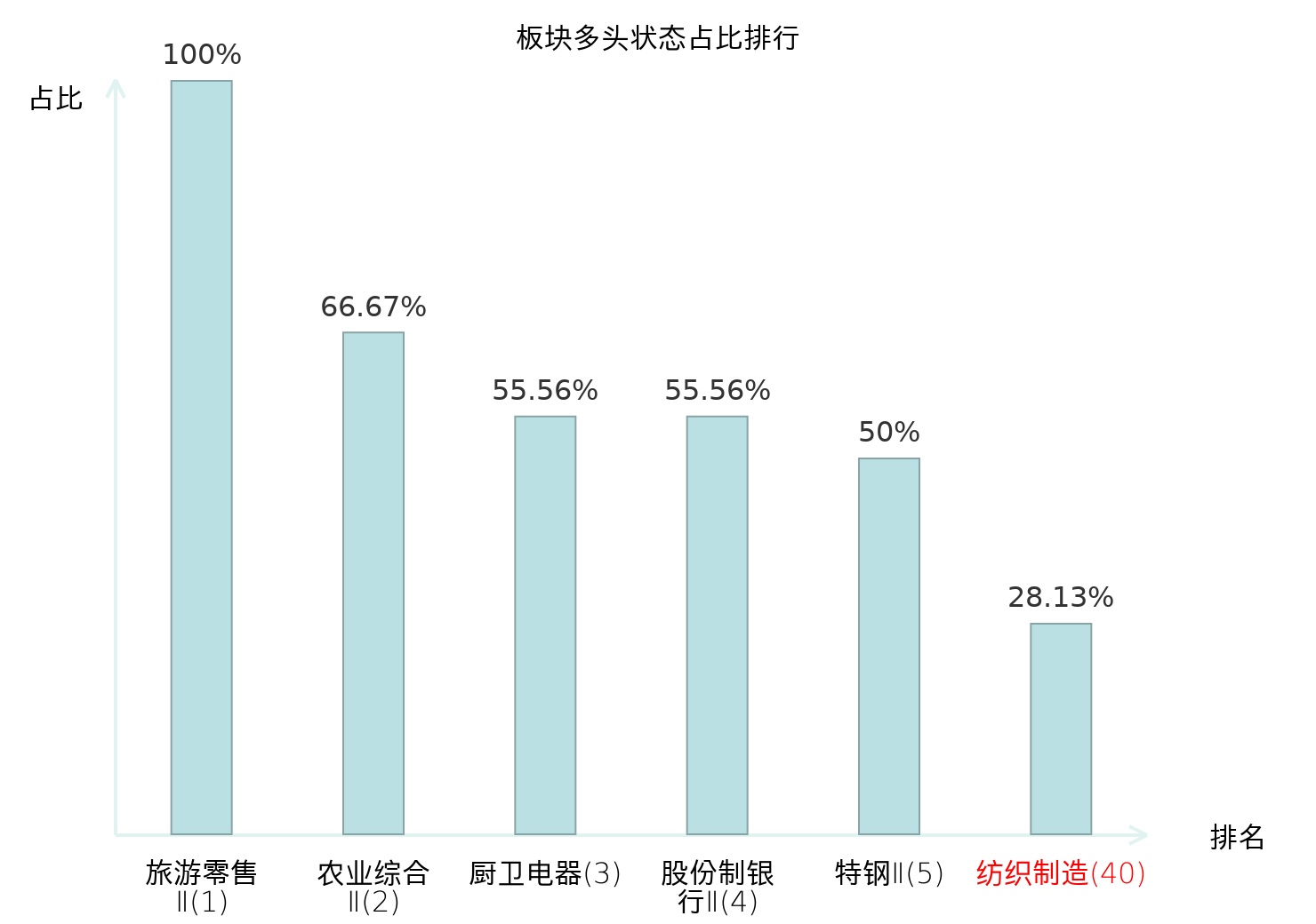 全市场所有行业板块中主力多头状态占比排名中,旅游零售Ⅱ板块位居第一。装修装饰Ⅱ板块名次提升最快,较昨日上升75位。