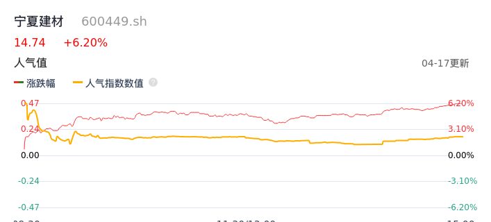 04月17日,宁夏建材收报14.74,股价涨幅6.20%,成交金额1.08亿元,换手率1.57%。