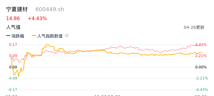 04月26日,宁夏建材收报14.86,股价涨幅4.43%,成交金额1.47亿元,换手率2.10%。