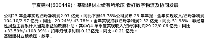 值得注意的是:2024年03月天风证券的鲍荣富/王涛/林晓龙分析师,首次发布关于宁夏建材的研究报告,标题为:宁夏建材(600449):基础建材业绩有所承压 看好数字物流及协同发展。
