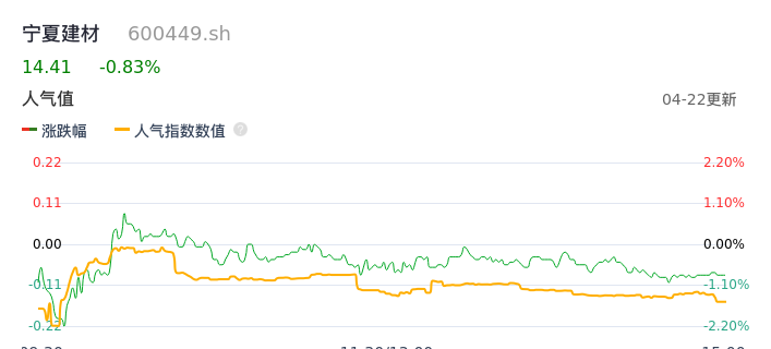 04月22日,宁夏建材收报14.41,股价涨幅-0.83%,成交金额6815.85万元,换手率0.99%。