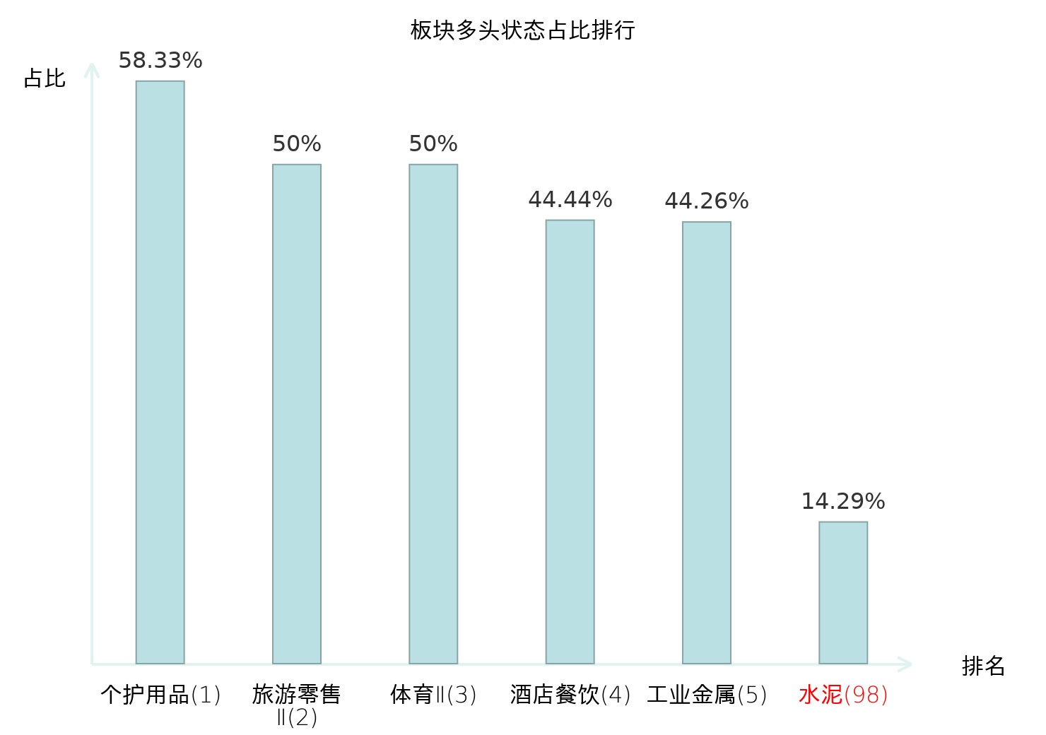 全市场所有行业板块中主力多头状态占比排名中,个护用品板块位居第一。非白酒板块名次提升最快,较昨日上升65位。