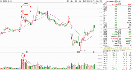 说明资金在这一线出现较大分歧,有大量资金离场,在高位形成换手,后面需要更多的资金接力才能推高股价,难度比较大,往往见顶的概率较高。