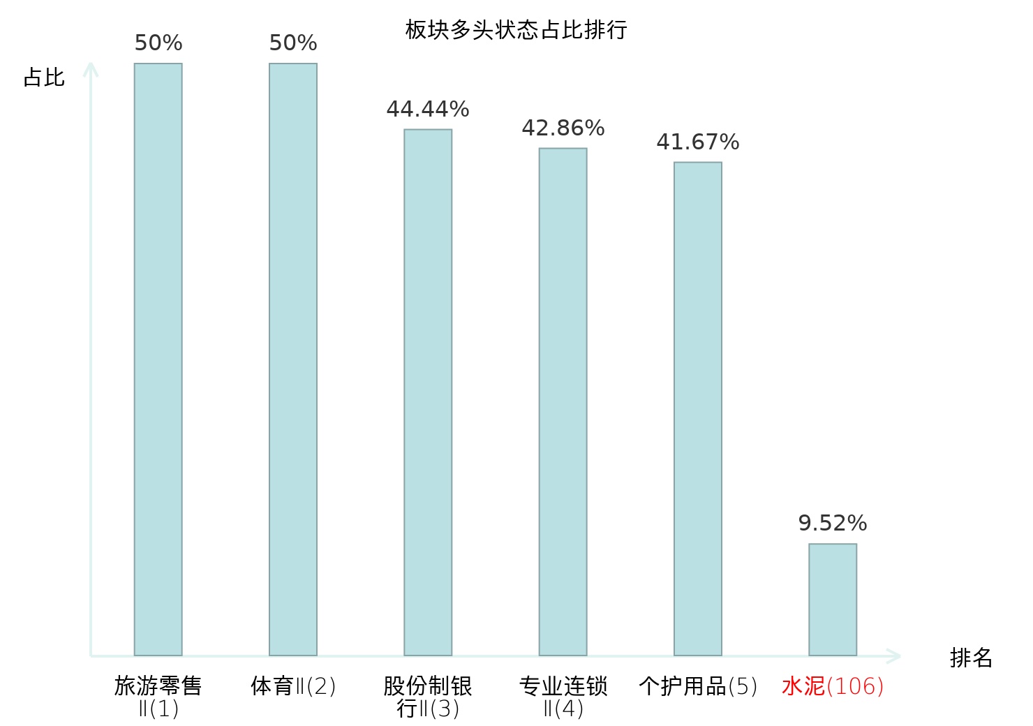 全市场所有行业板块中主力多头状态占比排名中,旅游零售Ⅱ板块位居第一。贵金属板块名次提升最快,较昨日上升83位。