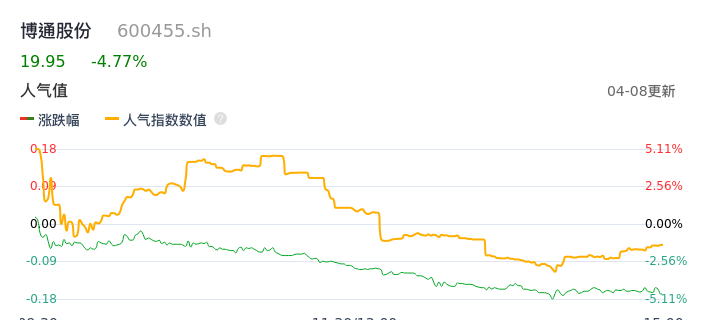 04月08日,博通股份收报19.95,股价涨幅-4.77%,成交金额3794.91万元,换手率2.99%。