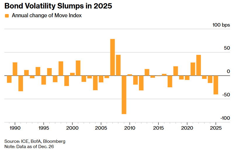 如上图所示,在2025年即将结束之际,美国国债市场波动率可谓大幅下滑。