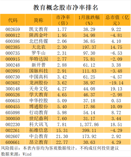 职业教育需求不减,凯文教育、陕西金叶等个股市净率较低估
