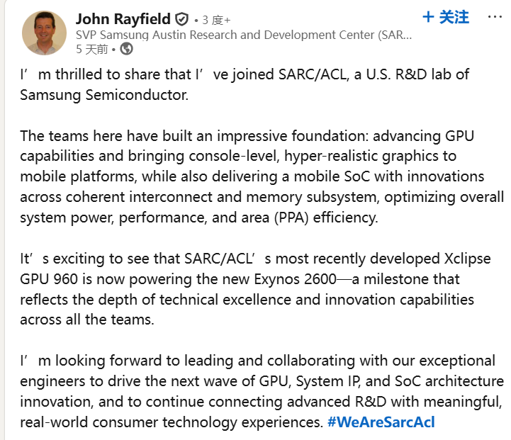 在官宣跳槽的帖子中,雷菲尔德就已经表示期待与三星团队合作,推动GPU、系统级IP以及SoC架构创新的下一波浪潮。