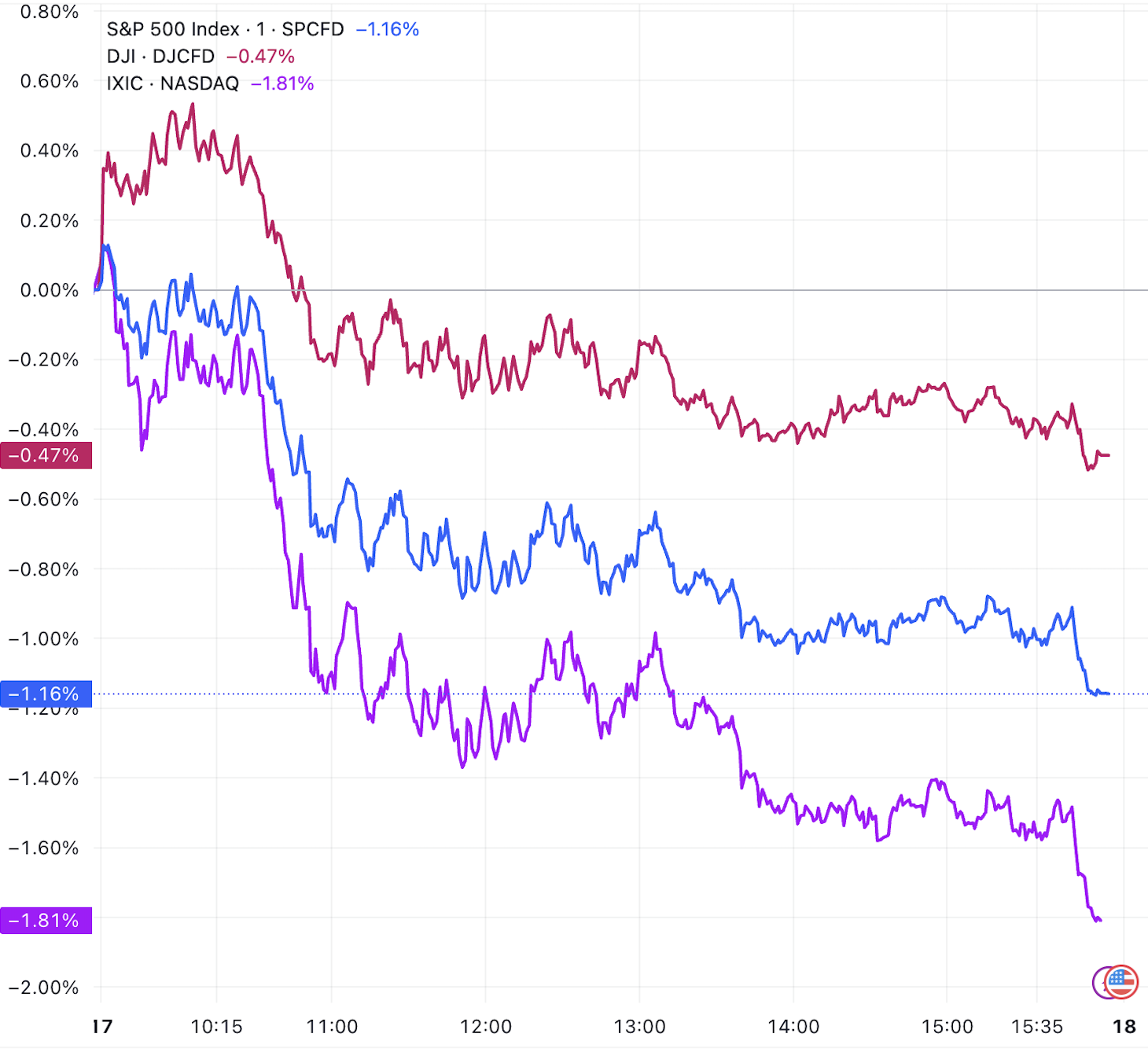 截至收盘,道琼斯指数跌0.47%,报47,885.97点;标普500指数跌1.16%,报6,721.43点;纳斯达克指数跌1.81%,报22,693.32点。