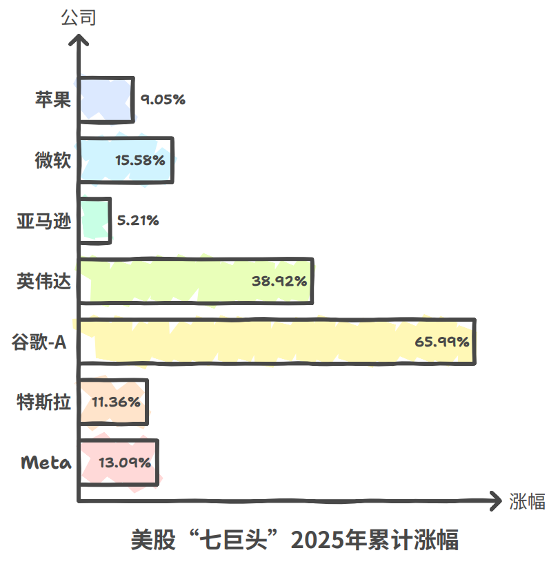 从全年表现来看,科技“七巨头”中除了谷歌和英伟达外,其他5家在2025年都没跑赢基准指数。