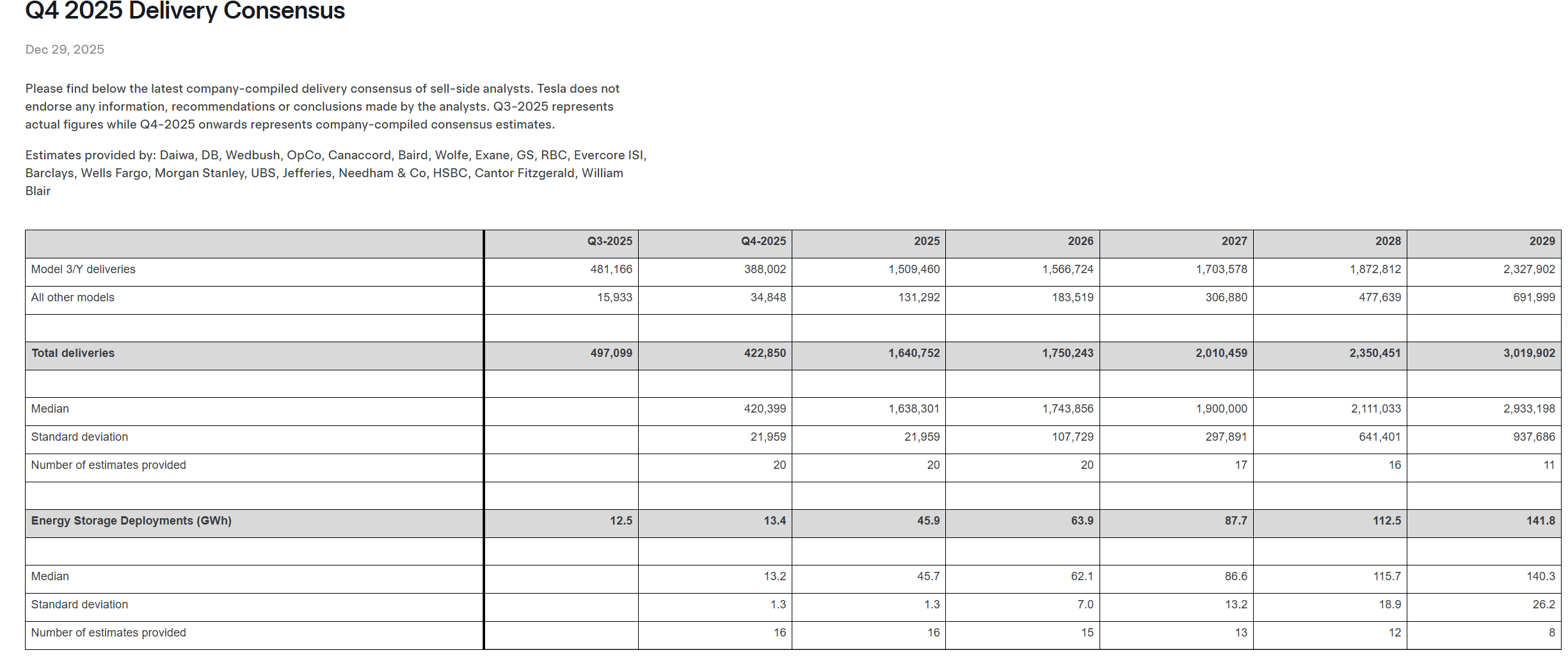 特斯拉周二下跌超1%。公司在投资者关系网站上罕见发布了公司汇编的2025年第四季度交付共识预期。根据特斯拉挑选的卖方分析师估算,公司预期将在本季度交付422,850辆汽车(同比下降15%),并部署13.4 GWh的电池储能系统。