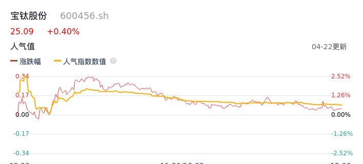 04月22日,宝钛股份收报25.09,股价涨幅0.40%,成交金额1.81亿元,换手率1.50%。