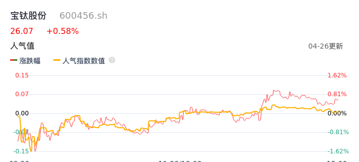 04月26日,宝钛股份收报26.07,股价涨幅0.58%,成交金额2.41亿元,换手率1.95%。