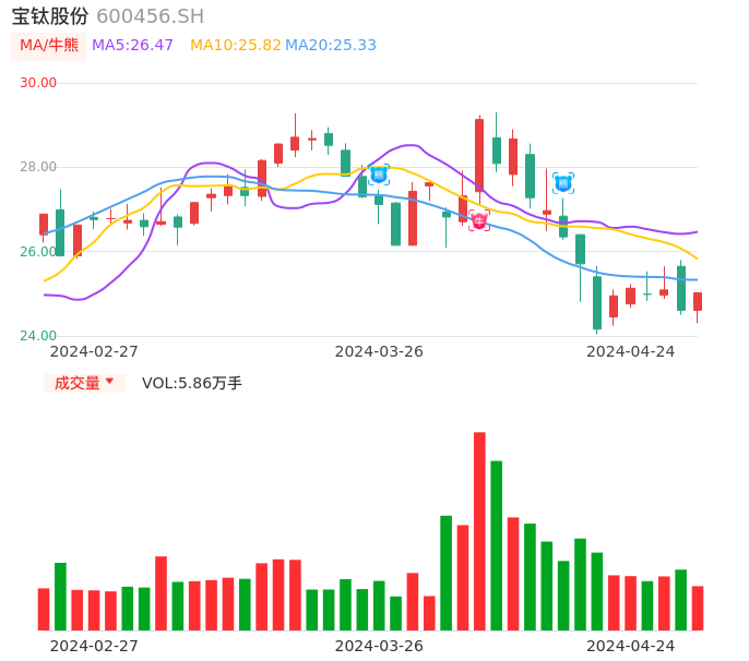 04月24日,宝钛股份收报25.02,股价涨幅1.67%,成交金额1.45亿元,换手率1.23%。