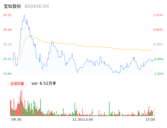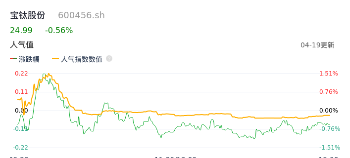 04月19日,宝钛股份收报24.99,股价涨幅-0.56%,成交金额1.64亿元,换手率1.37%。