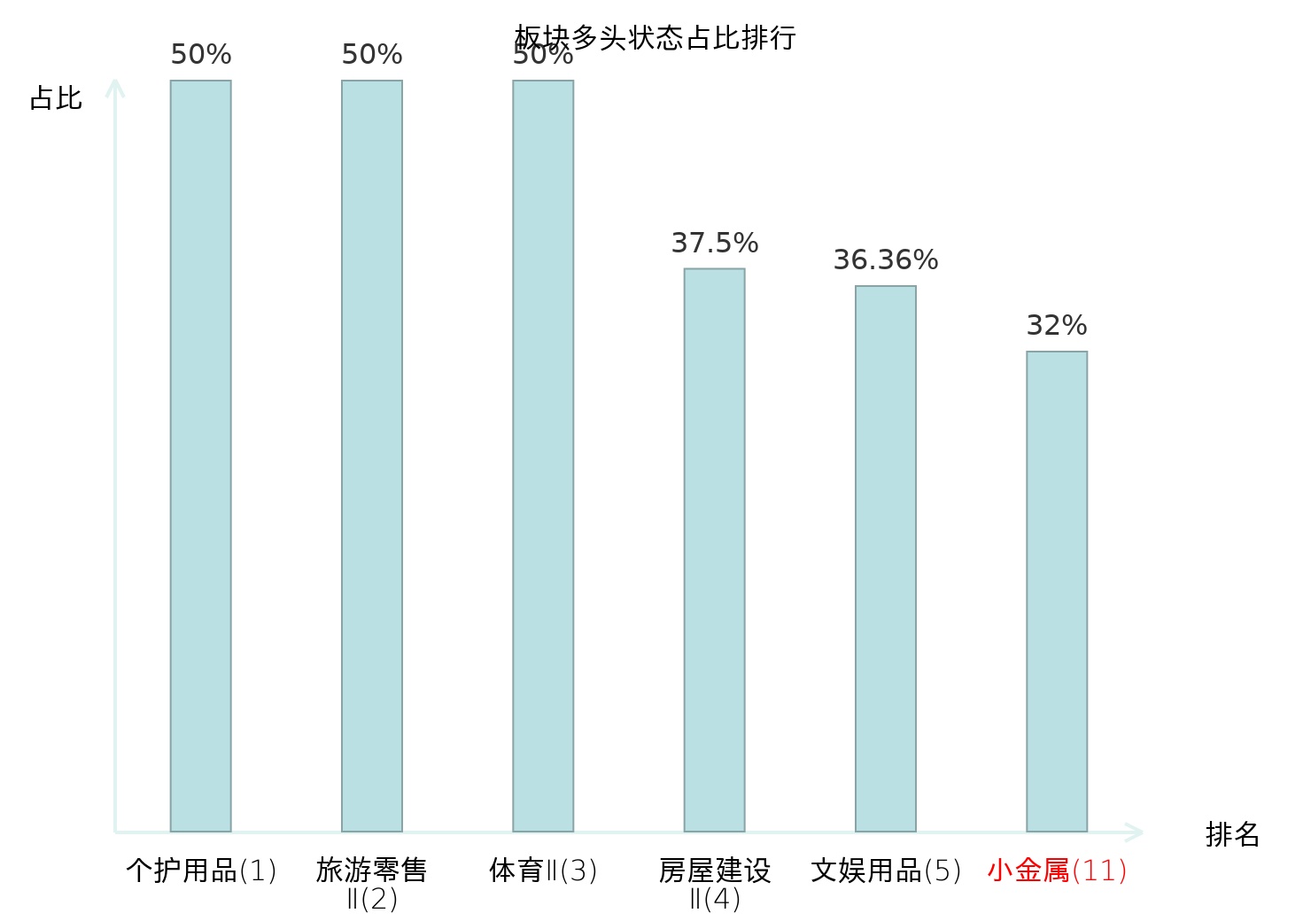全市场所有行业板块中主力多头状态占比排名中,个护用品板块位居第一。焦炭Ⅱ板块名次提升最快,较昨日上升68位。
