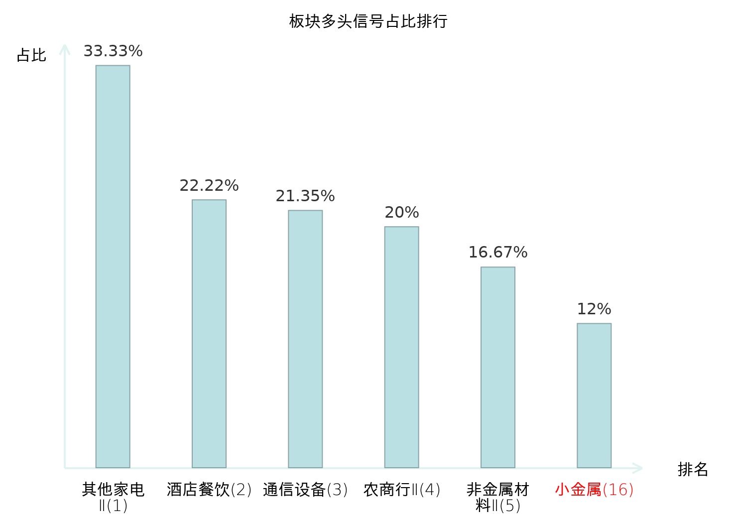 全市场所有行业板块中主力多头信号占比排名中,其他家电Ⅱ板块位居第一。其他家电Ⅱ板块名次提升最快,较昨日上升128位。