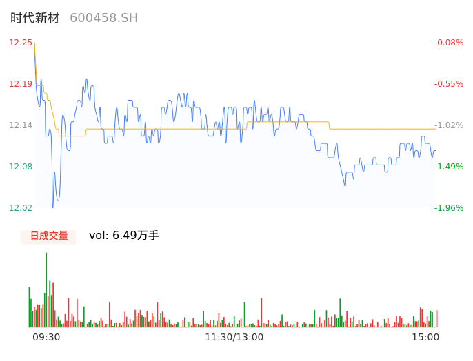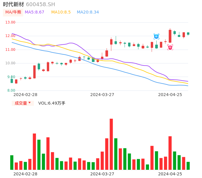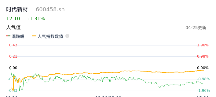 04月25日,时代新材收报12.10,股价涨幅-1.31%,成交金额7863.94万元,换手率0.81%。